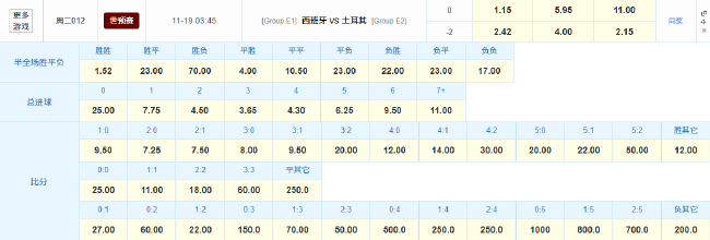 本场比赛在数据层面给到1.15(西班牙赢)5.95(平局)11.00(土耳其赢)的组合,